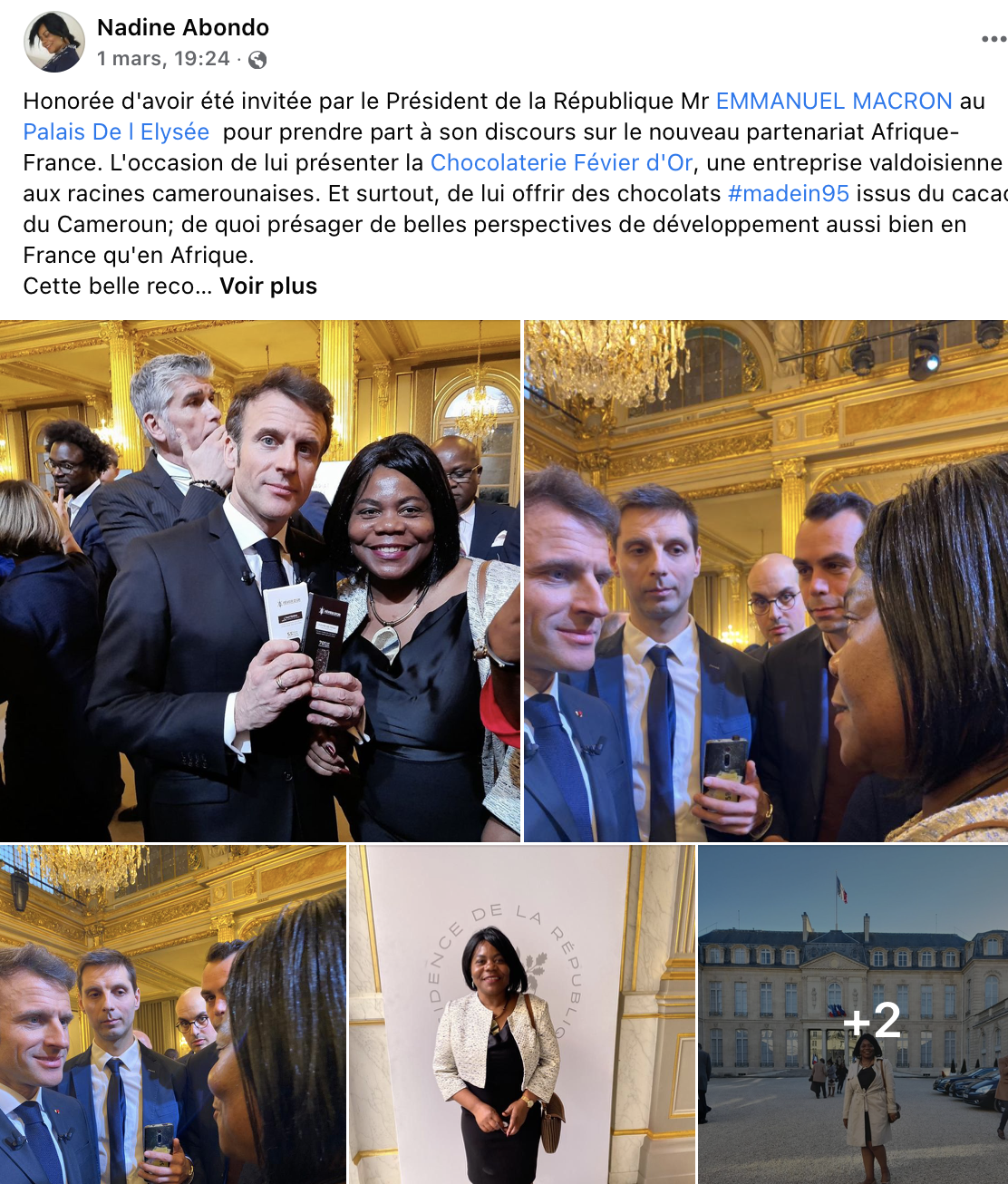 Nadine Abondo est l’une de nos 10 porteurs de projet sur la promotion 2022-2023 Meet Africa 2. Nous l’accompagnons depuis septembre dans son projet de coopérative de production de cacao au Cameroun. Elle a eu l’honneur d’être reçue à l’Elysée et de présenter ses chocolats au Président de la République. Un symbole qui couronne son engagement et son impact à cheval entre l’Île-de-France et le Cameroun.